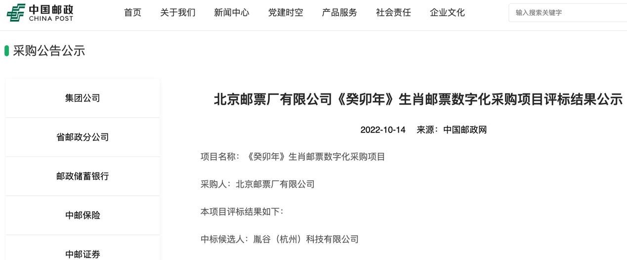 據(jù)中國(guó)郵政網(wǎng)消息,10月14日,北京郵票廠有限公司發(fā)布采購(gòu)項(xiàng)目評(píng)標(biāo)結(jié)果,胤谷(杭州)科技有限公司中標(biāo)生肖郵票數(shù)字化項(xiàng)目。這也是繼此前5G郵票數(shù)字化發(fā)布后,胤谷科技再度攜手中國(guó)郵政打造生肖元宇宙產(chǎn)品。